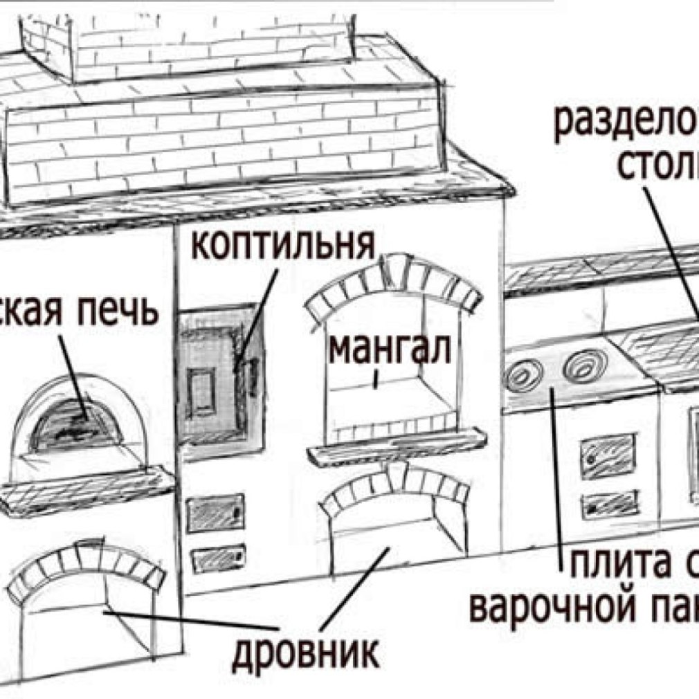 Печь для беседки из кирпича с мангалом и коптильней схема